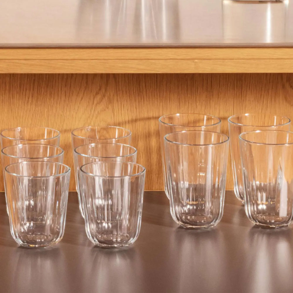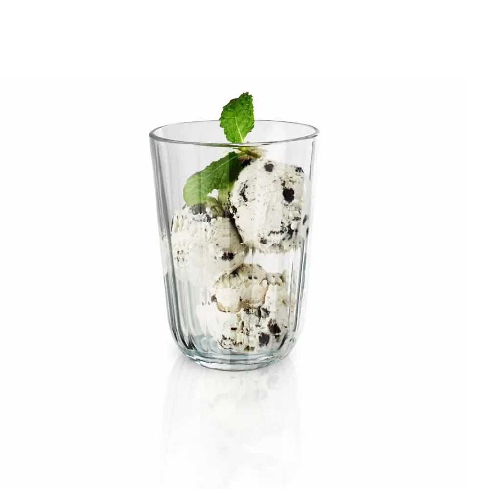 Stabiles, schlichtes Trinkglas von EVA Solo mit Facettenschliff. Die Gläser bestehen aus gehärtetem Glas und sind bis 130 °C hitzebeständig und somit wunderbar für Kalt- und Heißgetränke geeignet.