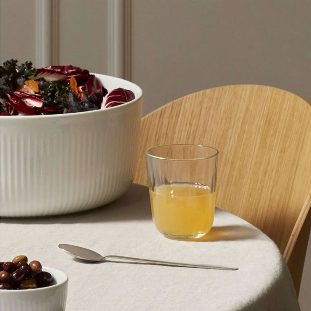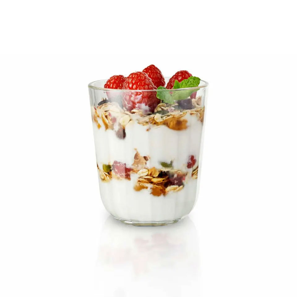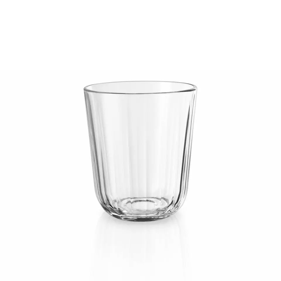 Stabiles, schlichtes Trinkglas von EVA Solo mit Facettenschliff. Die Gläser bestehen aus gehärtetem Glas und sind bis 130 °C hitzebeständig und somit wunderbar für Kalt- und Heißgetränke geeignet.