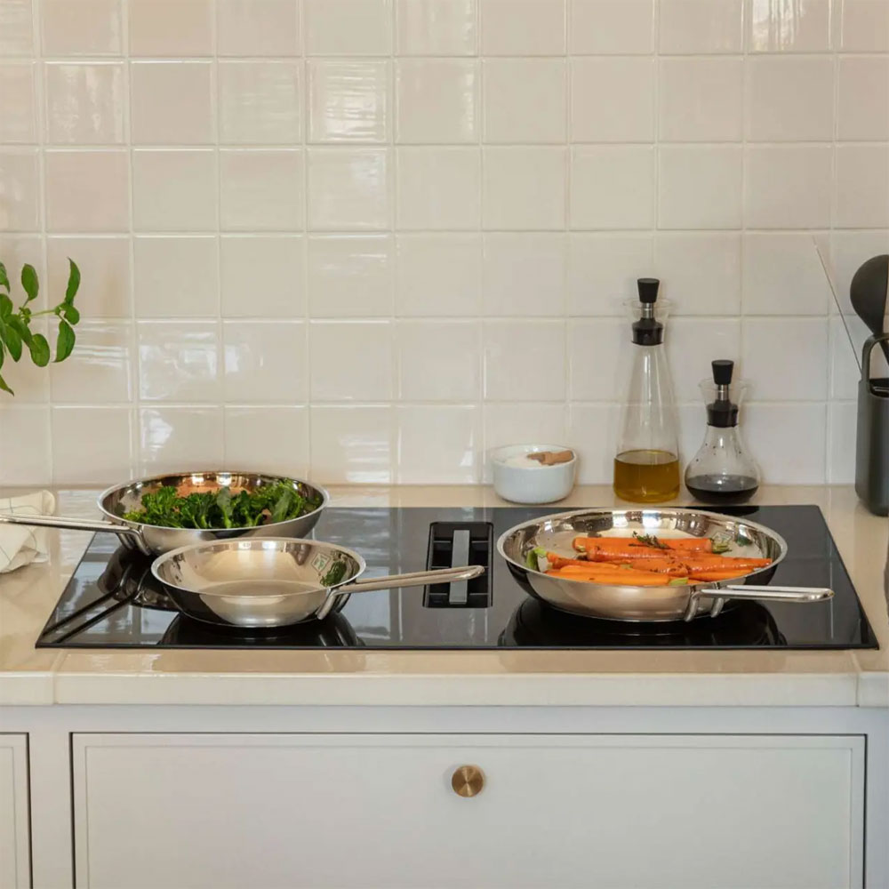 Der Korpus der Pfanne besteht aus 90 % Post-Consumer-Recycling-Edelstahl – ein unverwüstliches Material, das hohen Temperaturen, Metallutensilien und der Reinigung mit Stahlwolle standhält. Der massive Sandwichboden verteilt die Wärme gleichmäßig und reagiert rasch auf Temperaturänderungen, ganz gleich, ob Sie auf niedriger Stufe sautieren oder bei hoher Temperatur braten.