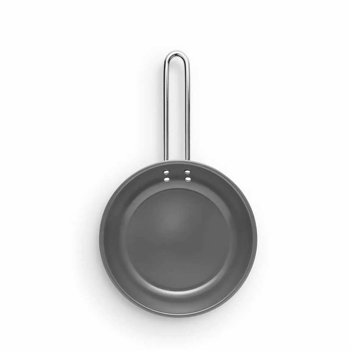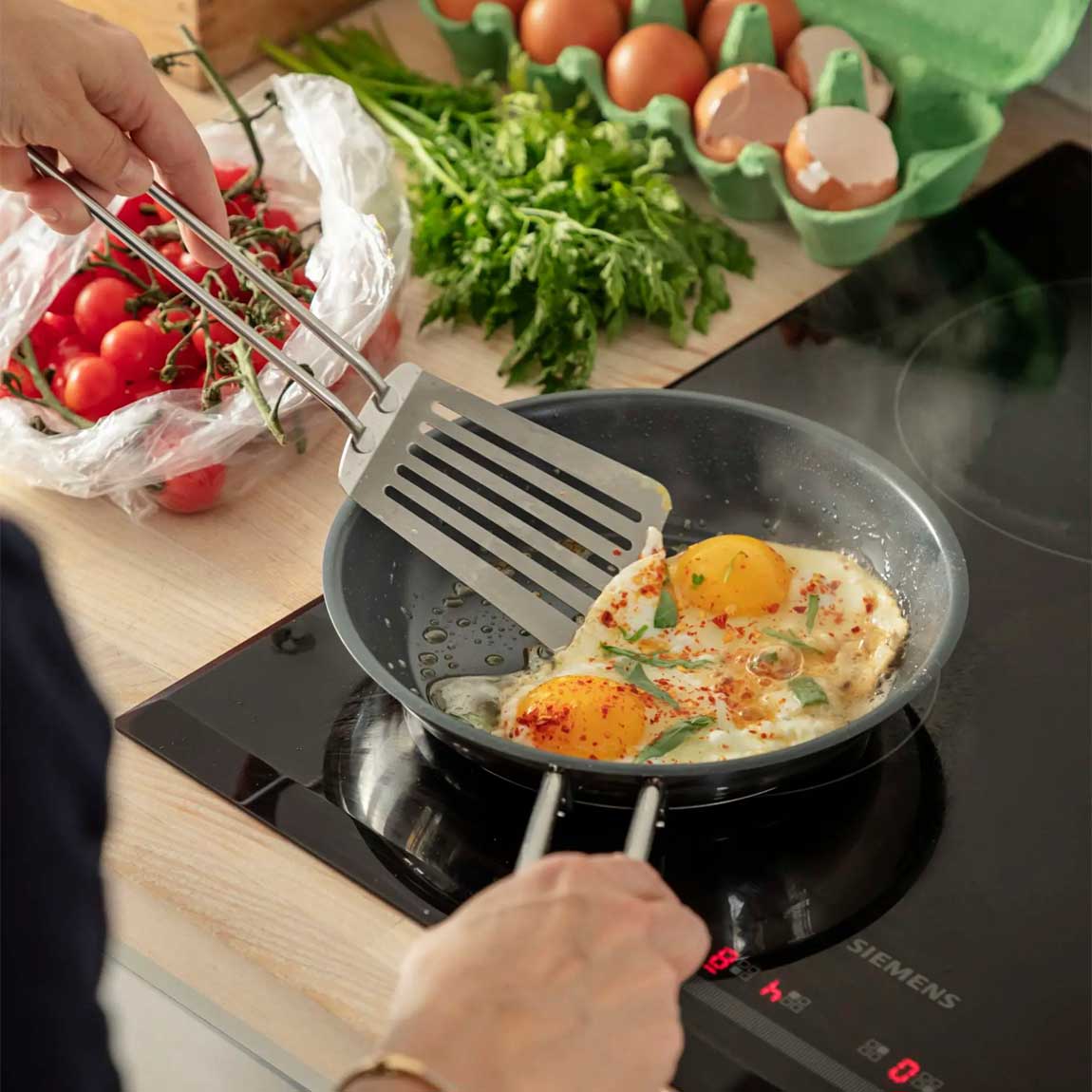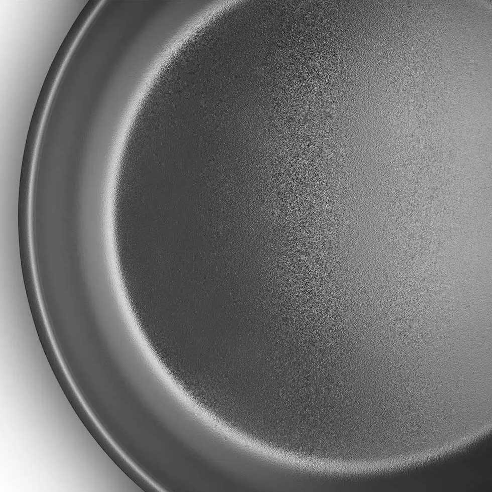 Der Korpus der Pfanne besteht aus 90 % Recycling-Edelstahl und verfügt über einen Sandwichboden, bei dem die Wärme gleichmäßig über die gesamte Bratfläche verteilt wird. Die Kombination aus Edelstahl und Titanoberfläche bildet die Grundlage für eine Pfanne mit beeindruckend langer Lebensdauer. Selbst nach vielen Jahren des Kochens und der Reinigung bewahrt sie ihr hübsches Aussehen und ihre herausragenden Eigenschaften.