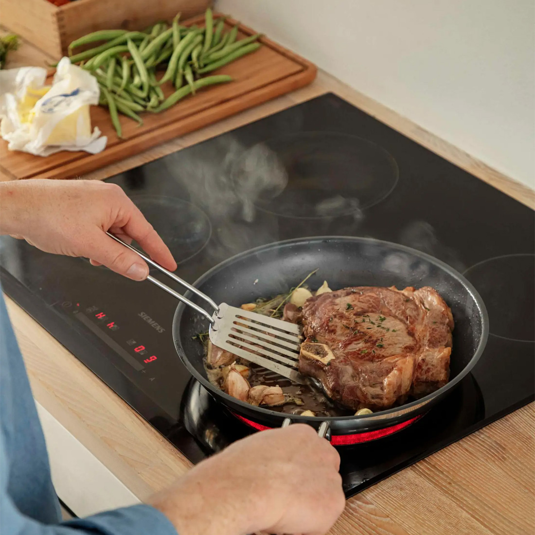 Laser Titanium setzt neue Maßstäbe in Sachen Langlebigkeit, Qualität und Komfort beim Kochen. Herzstück dieses modernen Designs ist die bahnbrechende Slip-Let® Laser Titanium-Oberfläche, bei der eine Titanlegierung mithilfe von Lasertechnologie direkt in den Edelstahl eingearbeitet wird. Das Ergebnis ist eine außergewöhnlich strapazierfähige und kratzfeste Oberfläche. Selbst bei täglichem Gebrauch von Metallutensilien bleibt die Oberfläche unbeschädigt. Gleichzeitig bietet die Konstruktion unübertroffene Antihafteigenschaften. Die glatte, PFAS-freie Oberfläche sorgt dafür, dass das Bratgut leicht aus der Pfanne gleitet, und macht die Reinigung zum Kinderspiel.