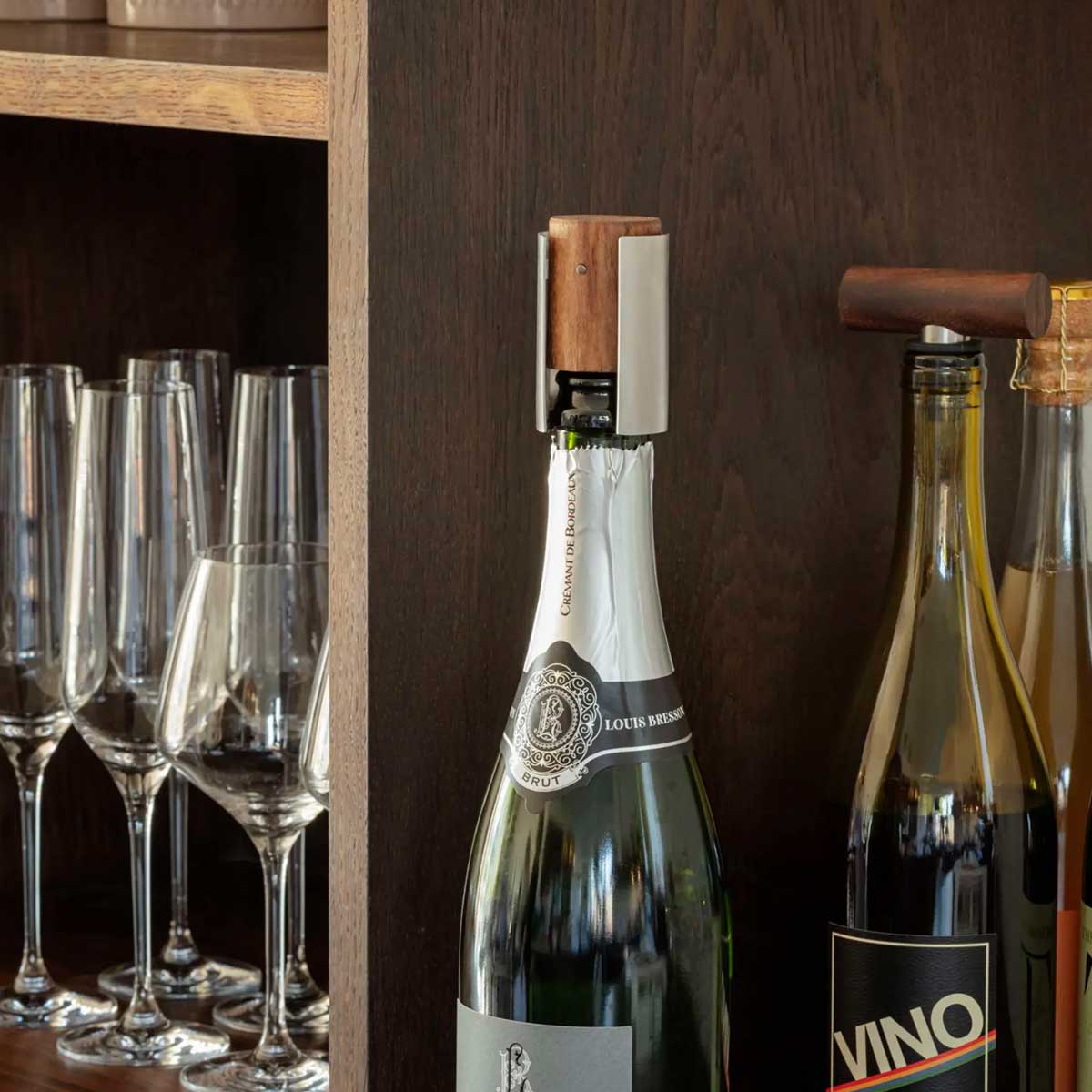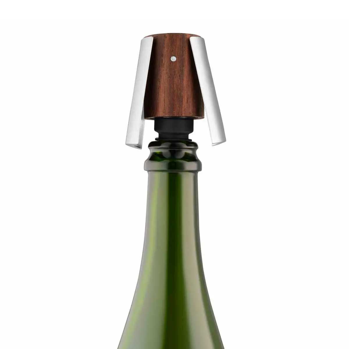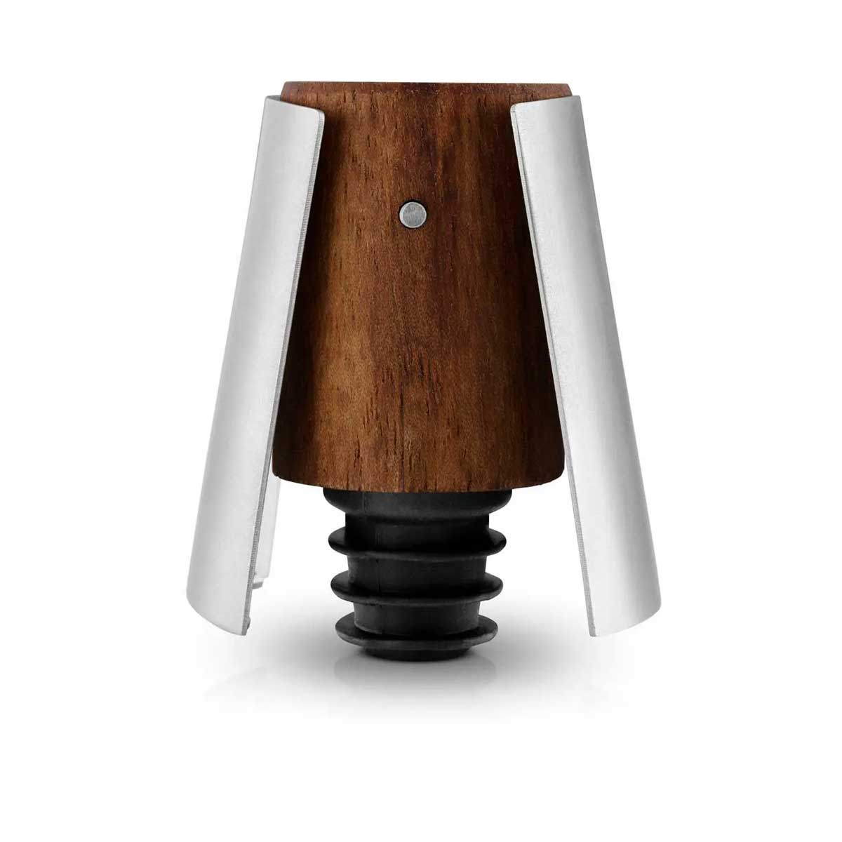 Lassen Sie die Sektkorken knallen! Der Liquid Lounge Sektverschluss verlängert den Genuss Ihrer Champagner- und Sektflaschen, indem er Geschmack, Frische und Perlage noch lange nach dem Öffnen bewahrt. Der Verschluss verschließt die Flaschenöffnung und verhindert das Eindringen von Luft, sodass der Inhalt frisch bleibt. Drücken Sie den Verschluss nach unten um den Flaschenhals herum, und drücken Sie dann die Seiten zusammen, damit er sicher und dicht sitzt. Zum Sichern des Verschlusses wird nur leichter Druck benötigt. Hergestellt aus Nussbaumholz und Edelstahl. Eine praktische und elegante Lösung, die die Party um ein paar Tage verlängert. Auch für Weinflaschen geeignet.
