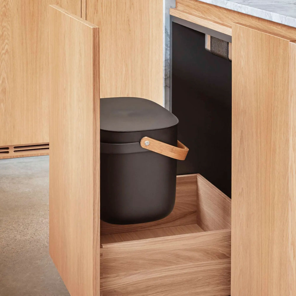 Ein Mülleimer muss nicht unmodern aussehen oder versteckt werden. Der elegante Reflect Abfallsortierbehälter ist Teil der Einrichtung und macht es zudem einfacher, das Zuhause sauber und ordentlich zu halten. Die Behälter lassen sich stapeln oder an der Wand montieren, was viel Platz spart. Der praktische Deckel lässt sich leicht offenhalten, während der Müll entsorgt wird – er greift automatisch und balanciert auf dem Rand des Behälters. Außerdem macht der Abfallbehälter den Einsatz von Spezialbeuteln überflüssig, da sich der integrierter Beutelhalter mühelos an unterschiedliche Beutelgrößen anpassen lässt. Der integrierte Tragegriff erleichtert das Transportieren des Abfallsortierbehälters, der aus den umweltfreundlichen Materialien Recycling-Kunststoff und Bambus hergestellt wird.
