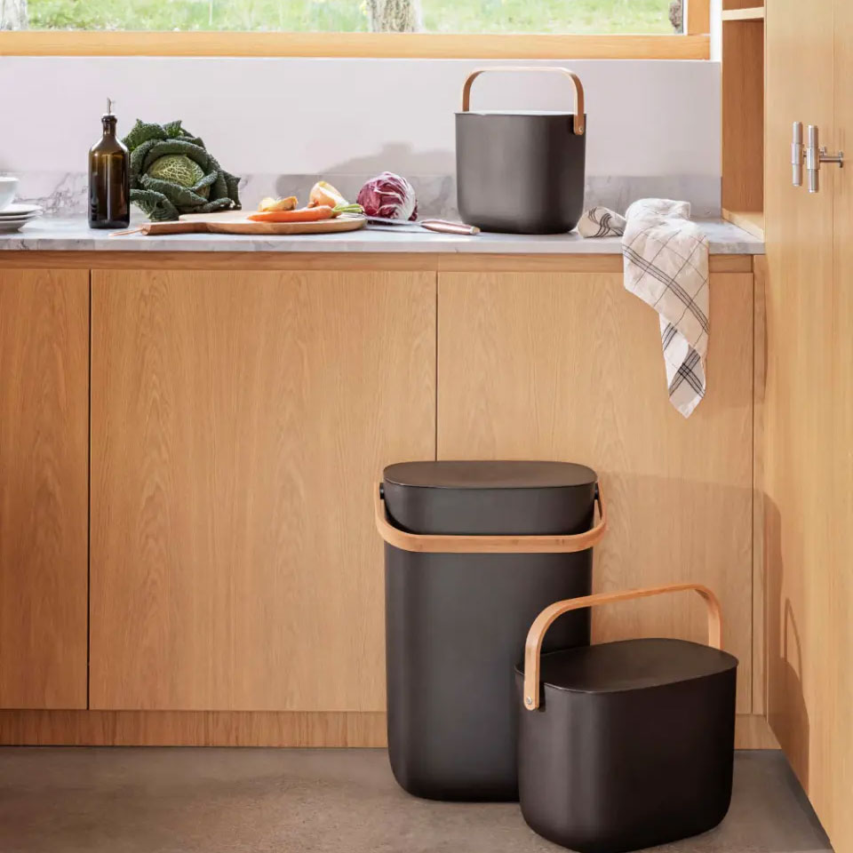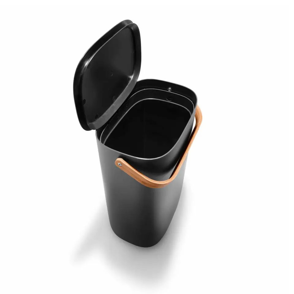 Ein Mülleimer muss nicht unmodern aussehen oder versteckt werden. Der elegante Reflect Abfallsortierbehälter ist Teil der Einrichtung und macht es zudem einfacher, das Zuhause sauber und ordentlich zu halten. Die Behälter lassen sich stapeln oder an der Wand montieren, was viel Platz spart. Der praktische Deckel lässt sich leicht offenhalten, während der Müll entsorgt wird – er greift automatisch und balanciert auf dem Rand des Behälters. Außerdem macht der Abfallbehälter den Einsatz von Spezialbeuteln überflüssig, da sich der integrierter Beutelhalter mühelos an unterschiedliche Beutelgrößen anpassen lässt. Der integrierte Tragegriff erleichtert das Transportieren des Abfallsortierbehälters, der aus den umweltfreundlichen Materialien Recycling-Kunststoff und Bambus hergestellt wird.