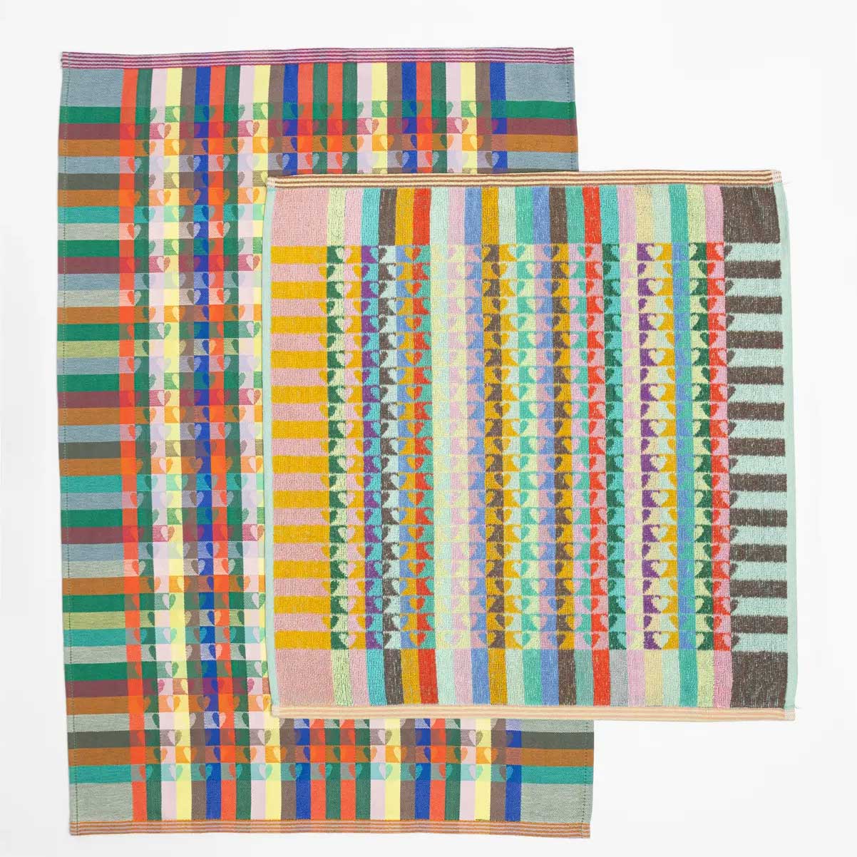 Dieses liebevolle 2er Set besteht aus einem Geschirrhandtuch und einem Küchenhandtuch. Also einem klassischen Tuch für das Abtrocknen von Gläsern und Geschirr und einem Handtuch für die Hände. Wie immer bei der Odds&Ends Kollektion von Foekje Fleur sind die Textilien ein Recycling-Produkt.