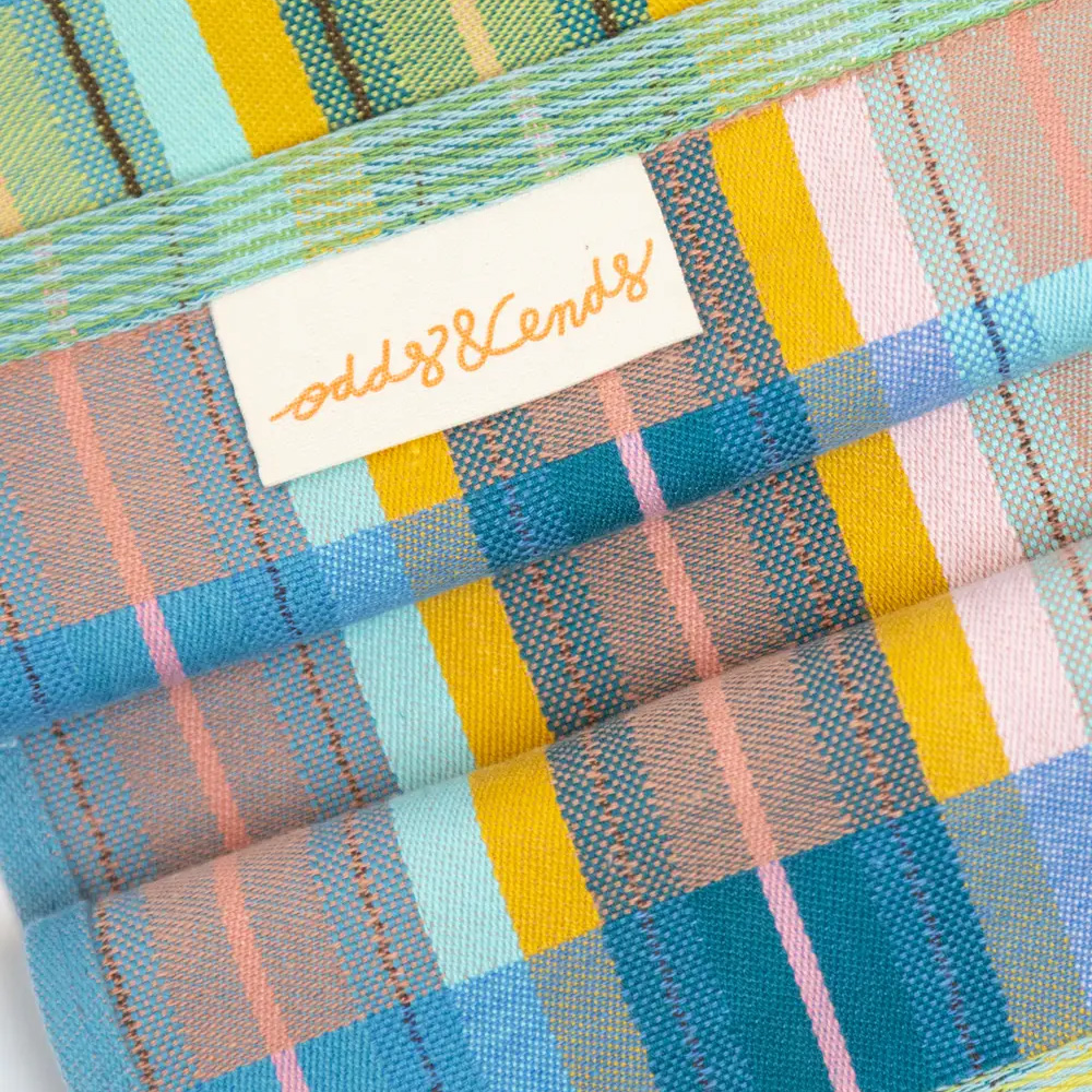Fröhliche Heimtextilien aus Industrieresten! Wenn Fabriken Garne färben um daraus später Textilien zu weben, stellen sie für alle Fälle immer etwas mehr davon her, vieles davon bleibt aber ungenutzt. Die Odds & Ends-Kollektion der holländischen Designerin Foekje Fleur nimmt sich gerade dieser vergessenen Garne an und schafft aus den Resten praktische Küchenhelfer in unerwarteten Farbkombinationen. Die Verwendung von Restgarnen bedeutet natürlich, das die Farben und Muster immer wieder neu entstehen und wir praktisch jeden Monat eine neue Kollektion aus Holland bekommen.