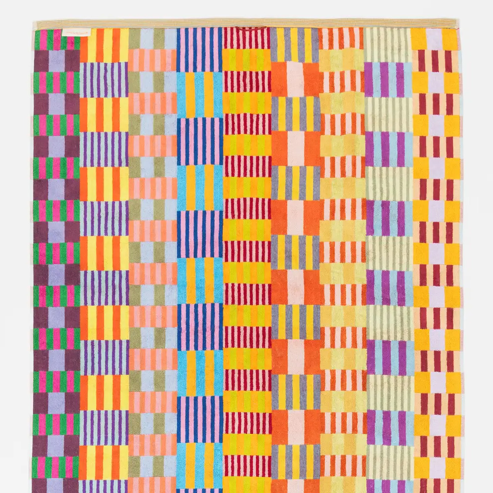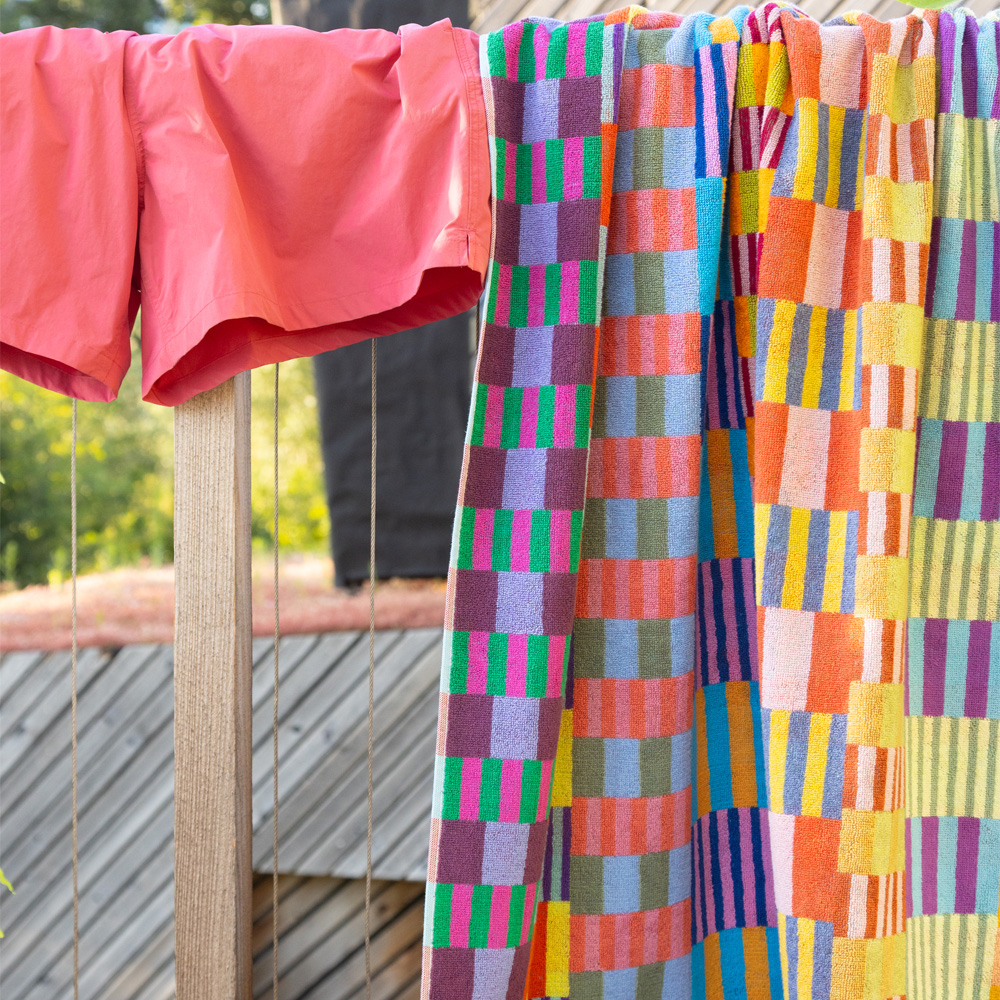 Das Strandhandtuch von Foekje Fleur aus Holland wirkt wirklich riesig. Satte 90x180cm recycelter Restgarn in tollen fröhlichen Farben und einem tollen Muster. Da macht der Urlaub gleich doppelt Spaß.