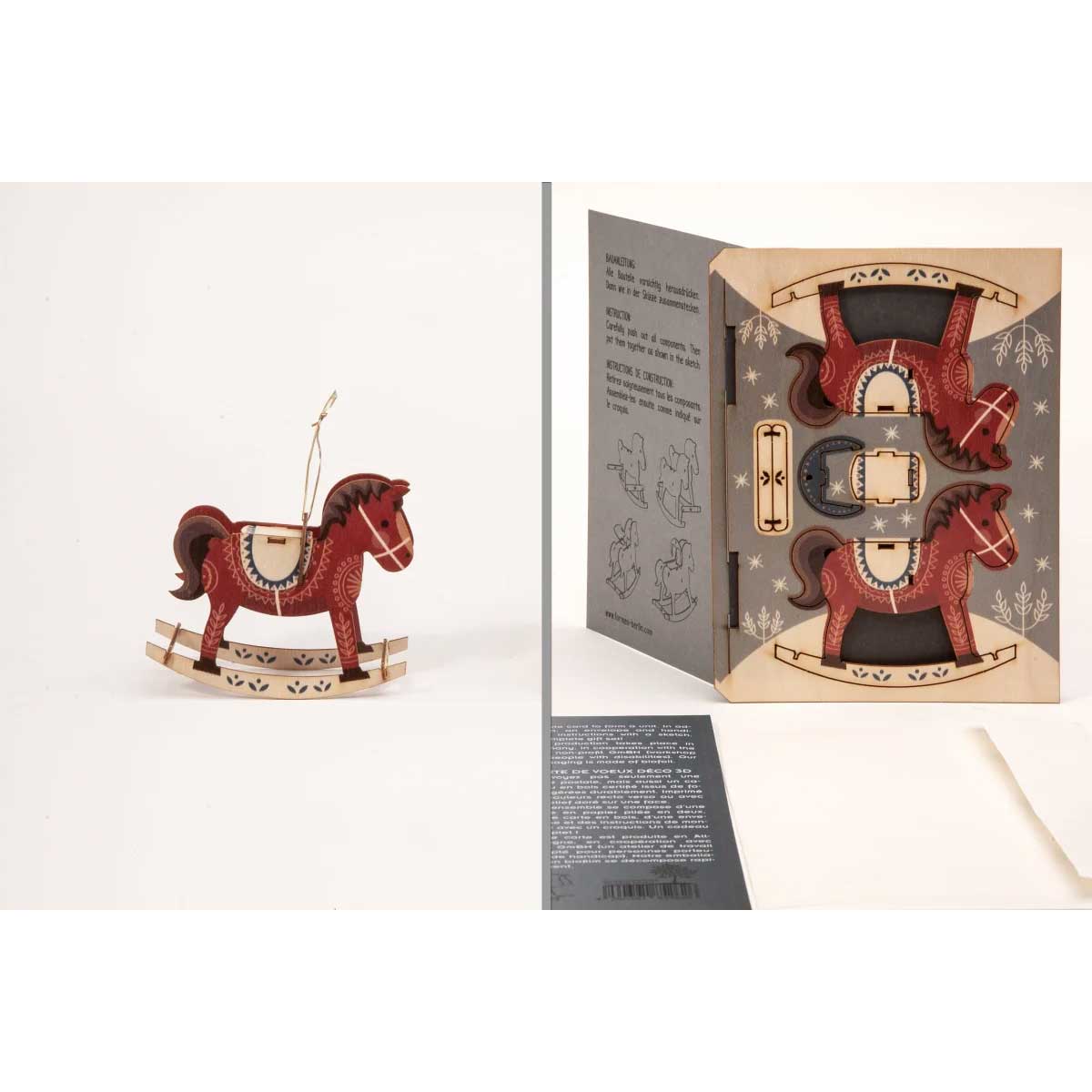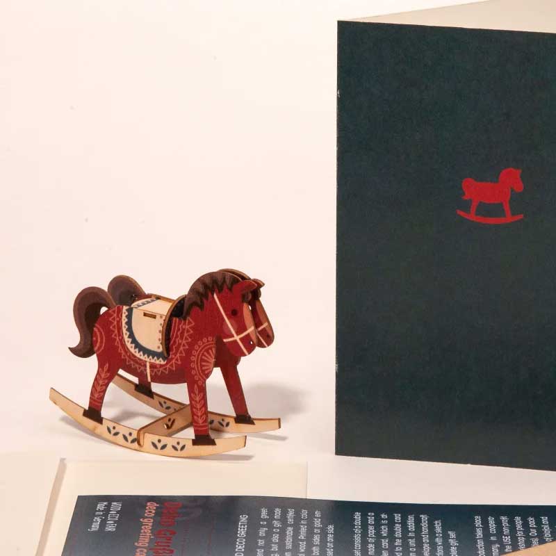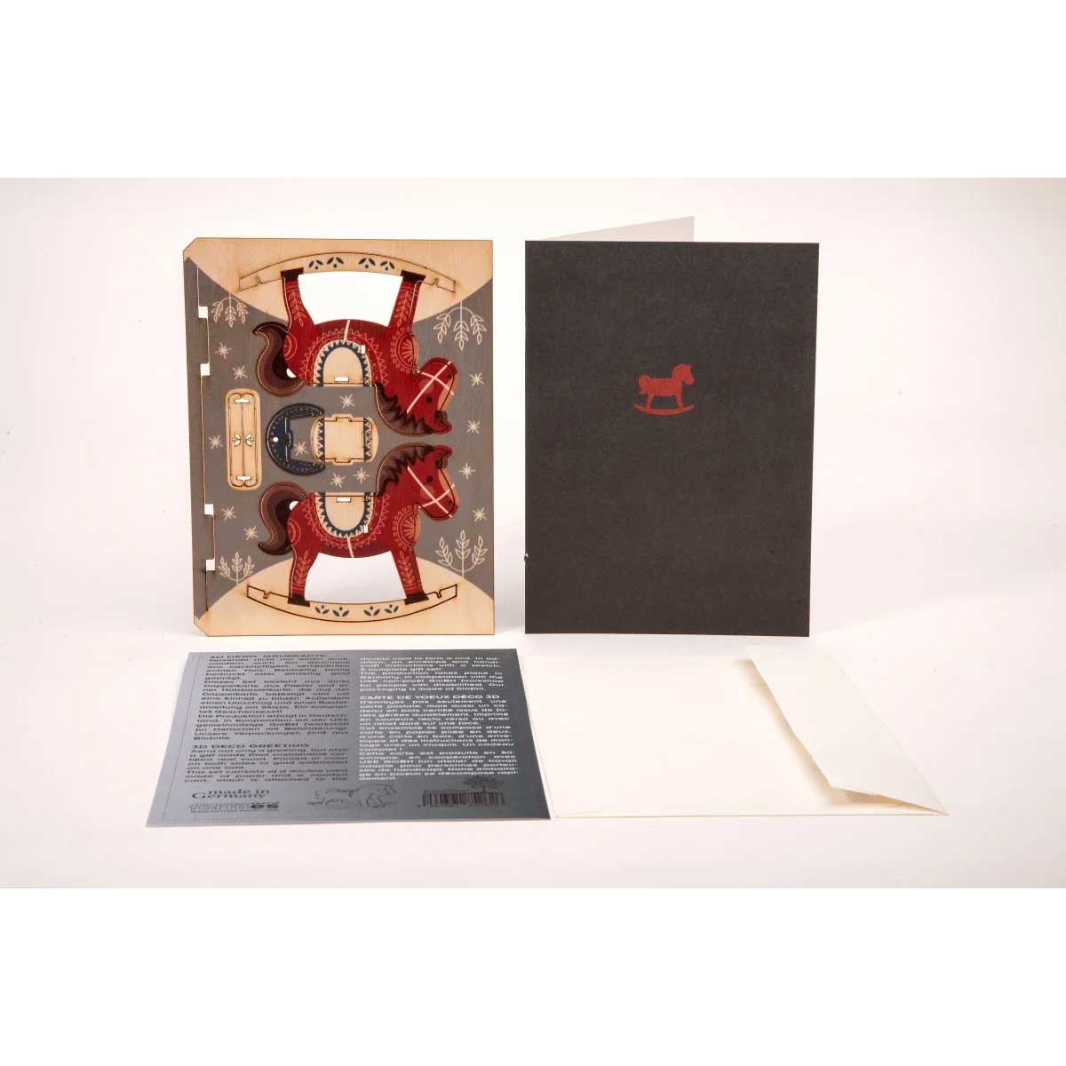 Ein weihnachtliches Schaukelpferd als Grußkarte und 3D-Bausatz. Diese wunderschöne Bausätze zum Aufhängen bekommen wir aus Berlin.