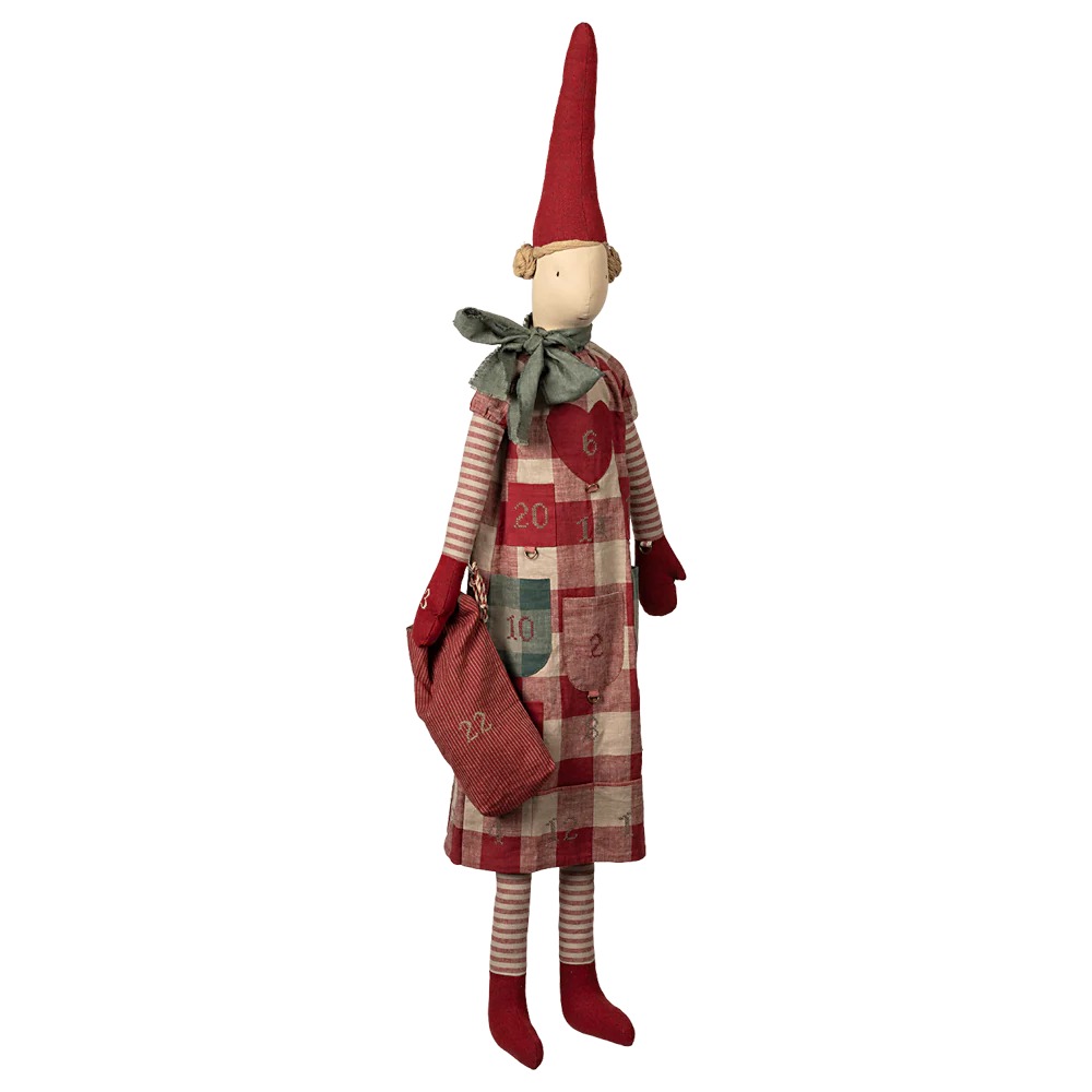 Dieses süße Pixy-Kalendermädchen von Maileg hat 24 Ringe und Taschen, in denen kleine Geschenke und Süßigkeiten befestigt werden können - eine für jeden Tag bis Weihnachten.