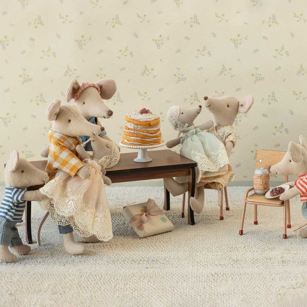 Lieferumfang: Eine Maileg-Babymaus mit Festkleid und weißer Haube. Lieferung ohne weiteres Zubehör. Kommt im hübschen Pappkarton