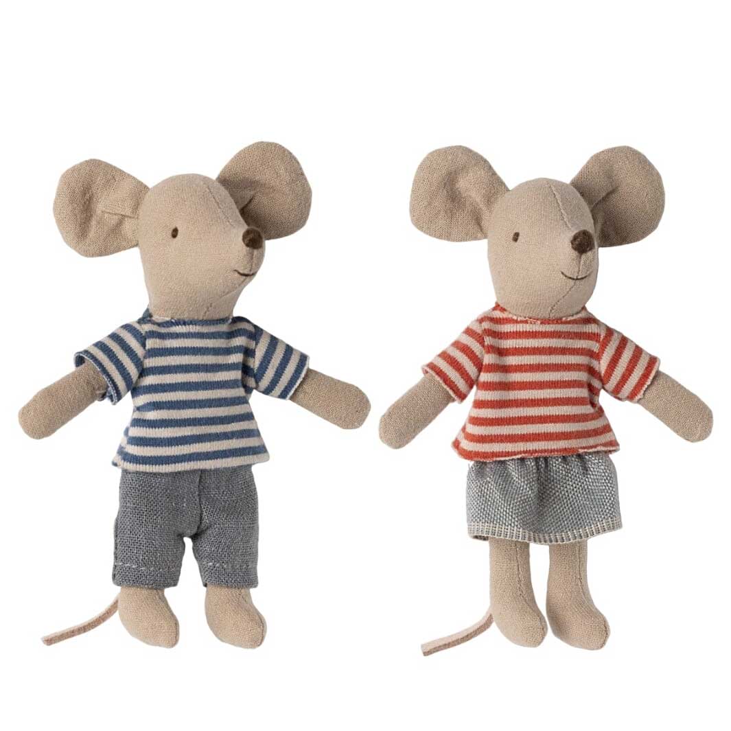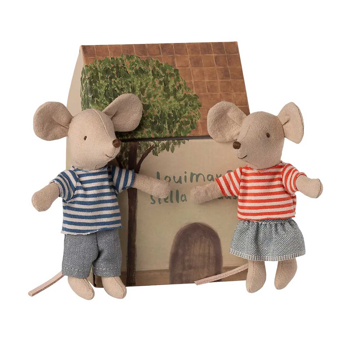 Die Maileg Mäuse LouiMax und Stella sind zwei entzückende, kleine Mäusegeschwister. Die beiden kommen in einem kleinen Häuschen aus Pappe, das ebenfalls mit viel Liebe gestaltet wurde. Ihre Kleidung aus Baumwolle und bei 30°C waschbar.