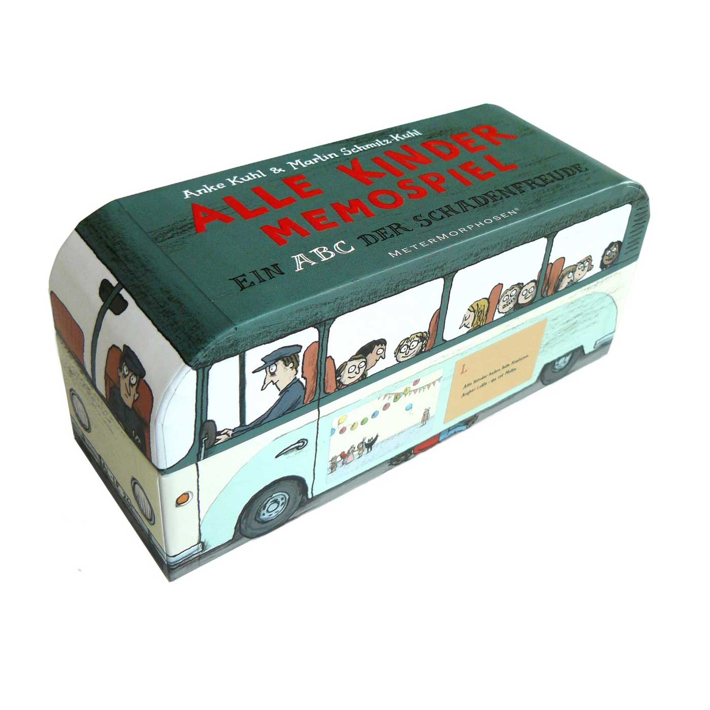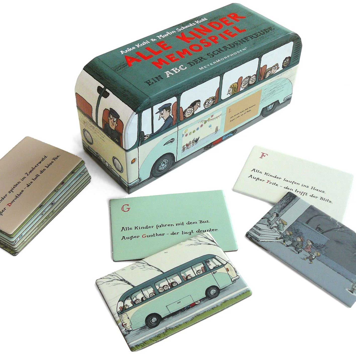 ALLE KINDER ist einer der größten Kinderbucherfolge der letzten Zeit. Verpackt in einem bunten Schulbus erhalten die originellen Ideen von Anke Kuhl mit den Versen ihres Mannes ein neues Leben als Memospiel für die ganze Familie. Die Zeichnungen von Anke Kuhl sind prägnant und witzig – wie auch die Reime, die die Zeichnungen zu kleinen Geschichte machen. In einer Wort- und einer Bildkarte erzählt dieses Memospiel zeitlose Episoden von einer Gemeinschaft an Grundschulkindern, die langsam lernt, was schwarzer Humor ist und welche Streiche und Verhaltensweisen inakzeptabel sind. Sie lernen auch – wie sonst nur in der Drastik von Märchen – dass einem das Lachen aus Schadenfreude manchmal im Hals stecken bleibt.