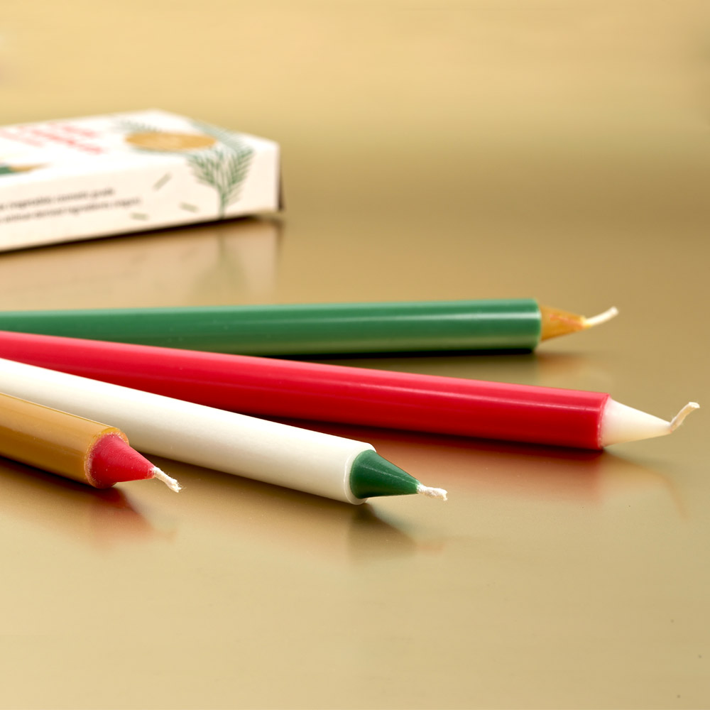 Lang und elegant … die XMAS Edition der Caps Candles spielt mit Farben und Farbkombinationen der Weihnachtszeit. Vier unterschiedliche Kerzenfarben sind mit jeweils anderer Farbe umhüllt – nur ihre kleinen, kegelförmigen Kappen sind sichtbar. Dieses kleine Detail macht die Caps Candles, die im Durchmesser einer Christbaumkerze entsprechen aber deutlich länger sind, so besonders und so sympathisch.
