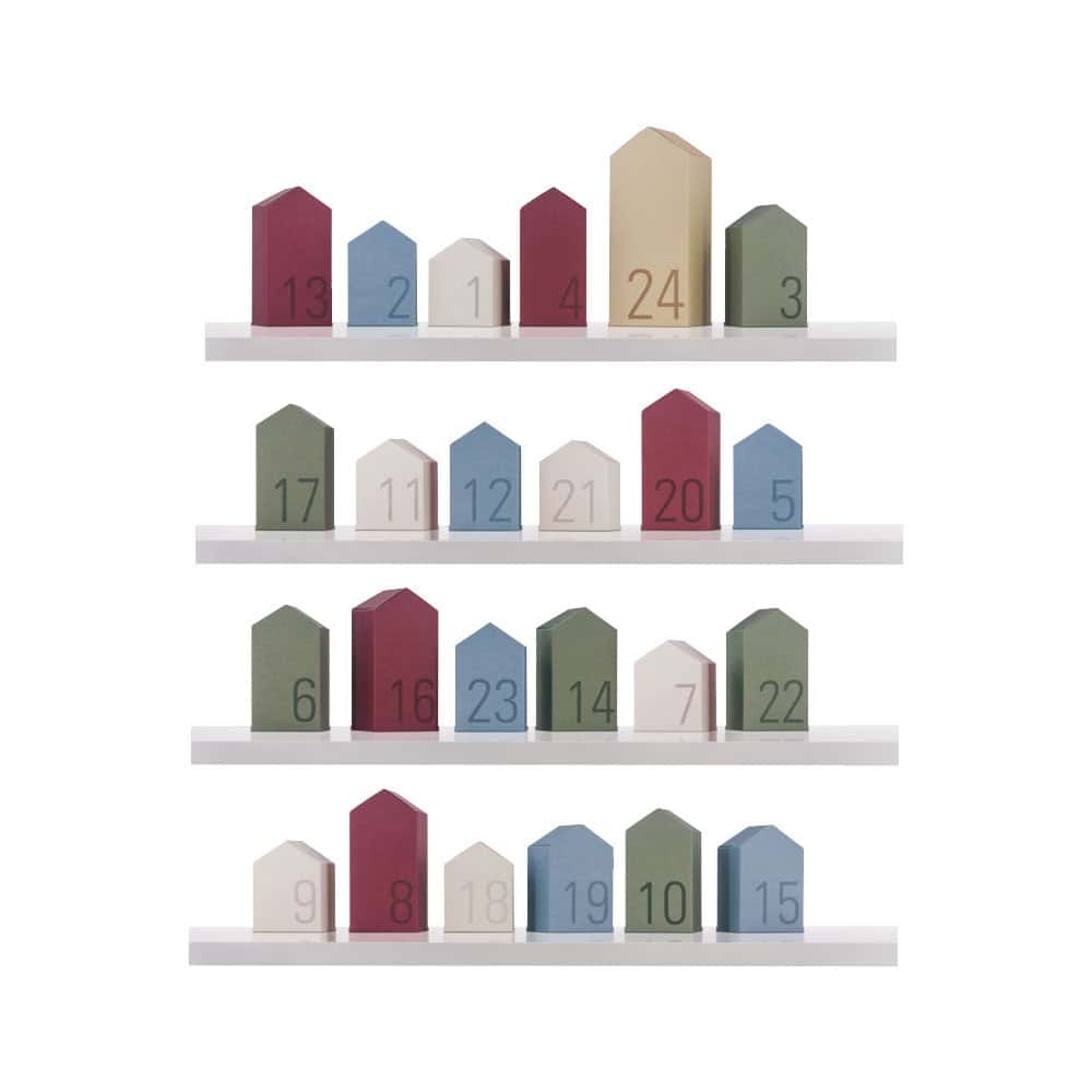24 nummerierte Häuser aus Pappe in 5 Farben und Größen. Die Häuschen sind flach verpackt und können ganz einfach zusammengesteckt werden.