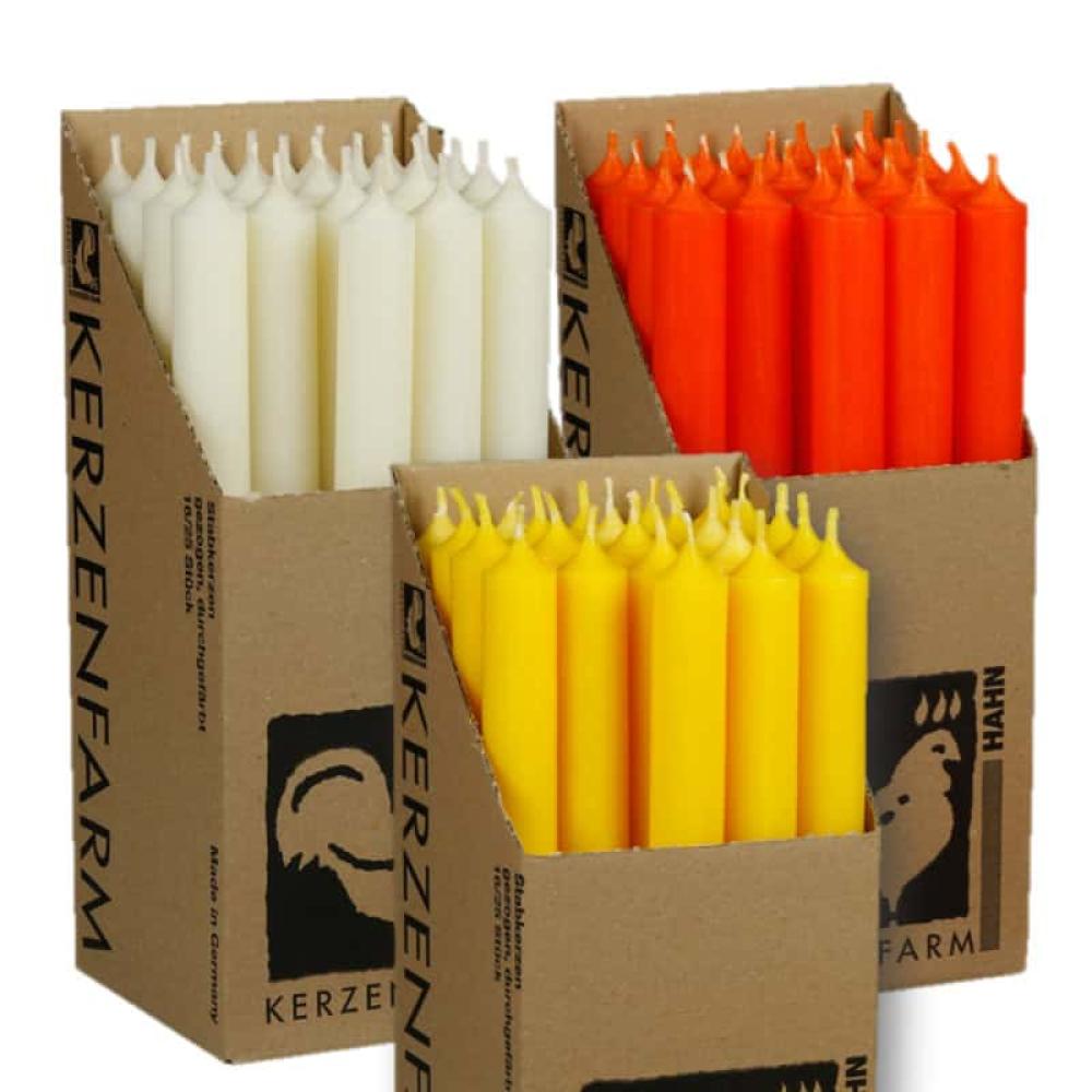 Die Stabkerzen der Kerzenfarm Hahn aus der Nähe von Hamburg führen wir nun schon seit Jahren. Die durchgefärbten Kerzen überzeugen uns immer wieder durch die lange und rußarme Brenndauer von ca.11,5 Std.