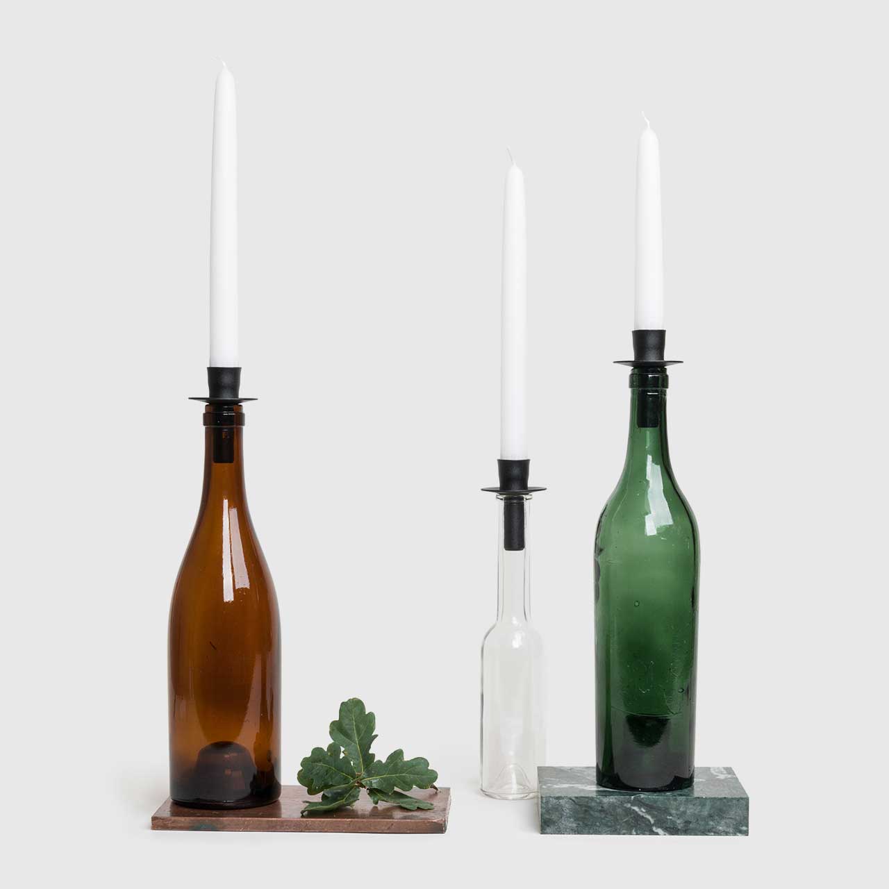 Der Flaska Kerzenhalter von der schwedischen Schmiede Vågesist ein simpler aber formschöner Kerzenhalter für handelsübliche Stabkerzen. Sie können den Kerzenhalter einfach auf Wein oder Spirituosenflaschen stecken und haben so einen Kerzenhalter der toll aussieht und einen Tropfenfänger für das herablaufende Wachs hat.